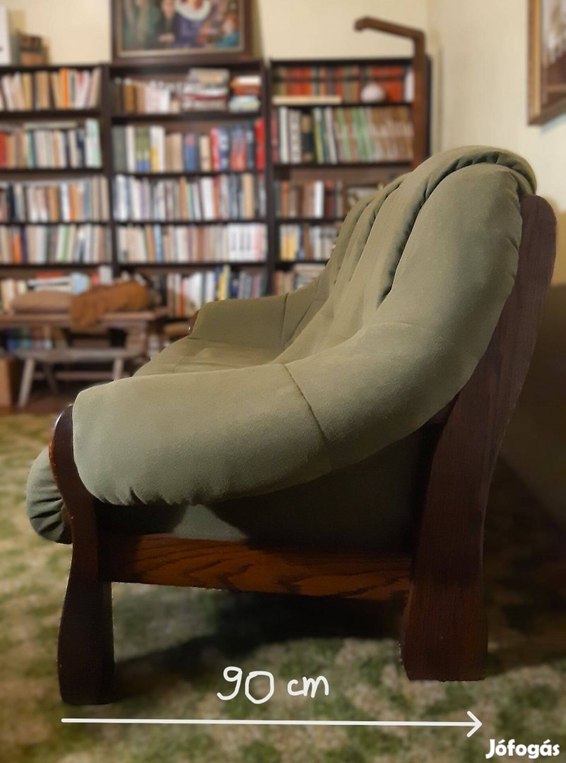3 személyes kanapé, mohazöld színben. Ép kárpit, könnyű trópusi fa váz, nem bútorlap! A párnázat egyben leemelhető, egyszerűen szállítható. Nem süppedős, keményebb szivacsos ülőfelület.