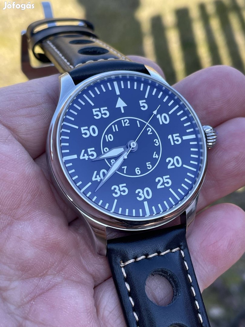A számlap és mutatók sötétben foszforeszkálnak. Igazán szép és nem mindennapi megjelenéssel bíró darab.