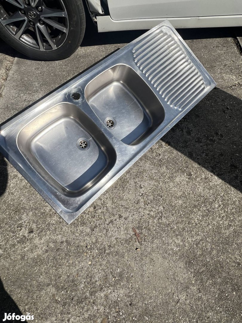 Dupla rozsdamentes mosogatótálca. Használt de jó állapotú. A csepegtető a jobb oldalon helyezkedik el.