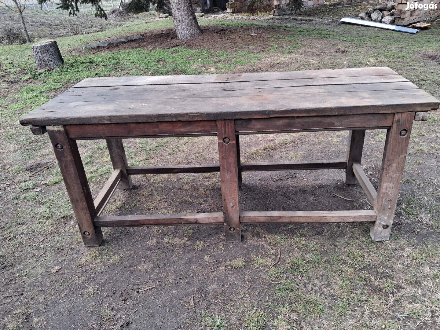 Eladó egy 200x70x80 cm-es munkapad, lábainál fém rudakkal van megerősítve.