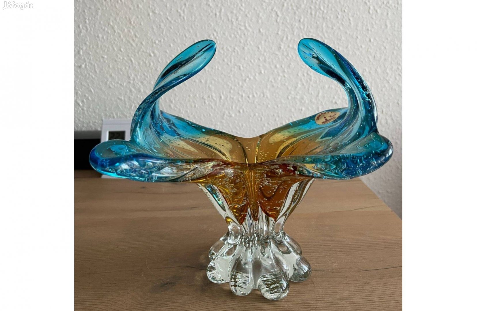 Stílus: organikus hullámzó forma, buborékos kék és borostyán színű árnyalatokkal .21 cm hosszú. 15 cm széles , 22 cm magas. Vitrinben tartott , hibátlan , eredeti Murano matricával ellátva.