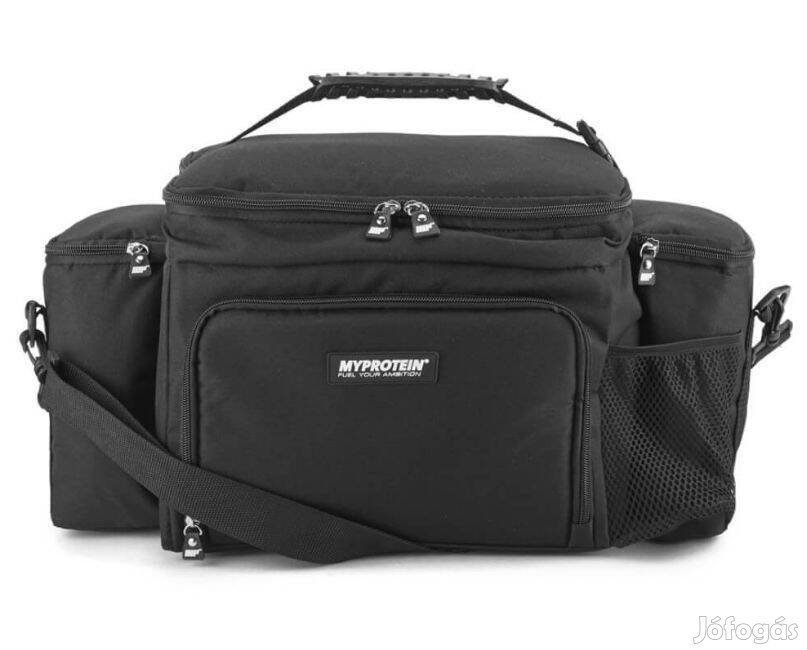 Új, fekete Myprotein Meal Bag hőszigetelt ételszállító sporttáska (a hozzá tartozó ételes dobozokkal és jégakkukkal) gyári csomagolásban.
