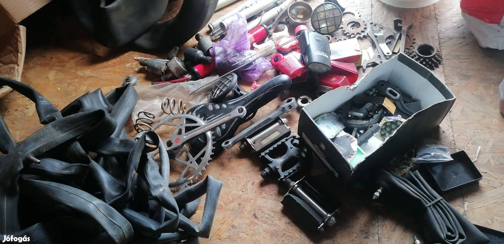 Nagy doboz bicikli alkatrész, belsők, lámpák, stb a képen látható állapotban vannak, nem tudom hogy jók e, de van benne új alkatrész is. Csak egyben adom el és az ár az egészre vonatkozik.
