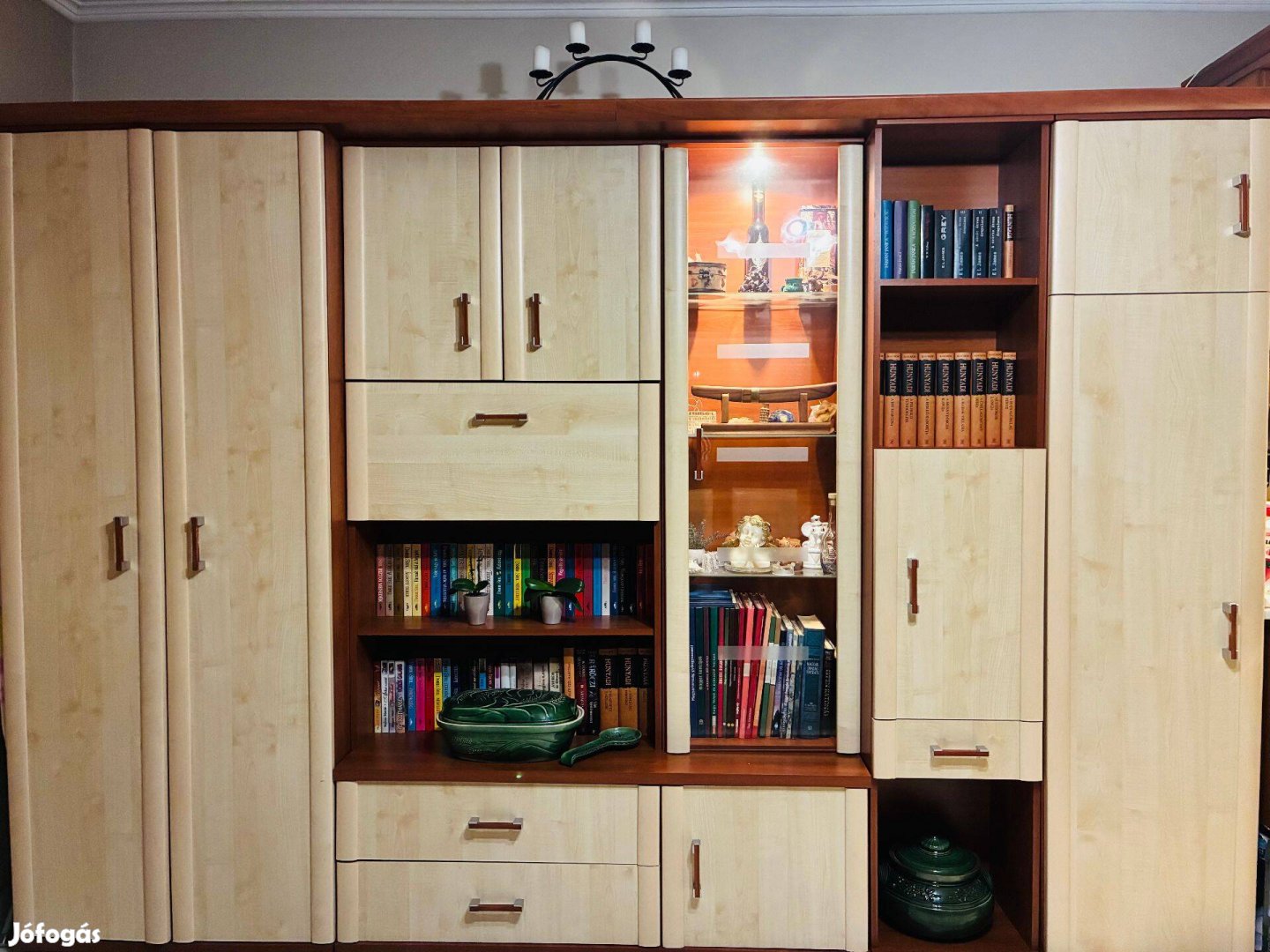 Eladó egy újszerű nappali szekrénysor, cseresznye színű vázzal és fogantyúkkal, valamint juhar fronttal, amely elegáns és időtálló megjelenést ad a bútornak. A beépített világítás hangulatos, modern összhatást biztosít.