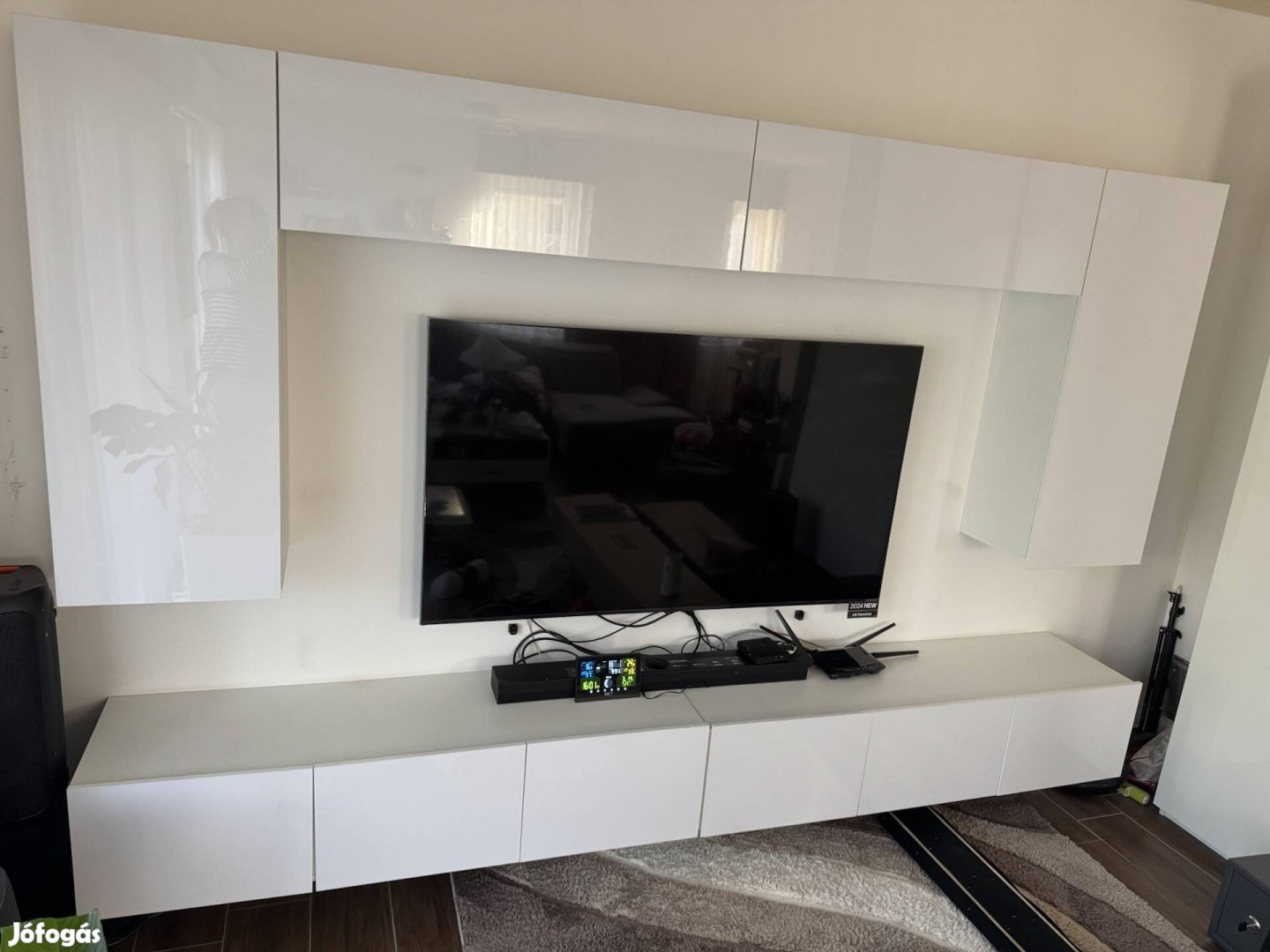 Eladó a képen látható szép állapotú 3 évet használt nappali szekrénysor, magas fényű fehér színben. Méretek, a képek között.