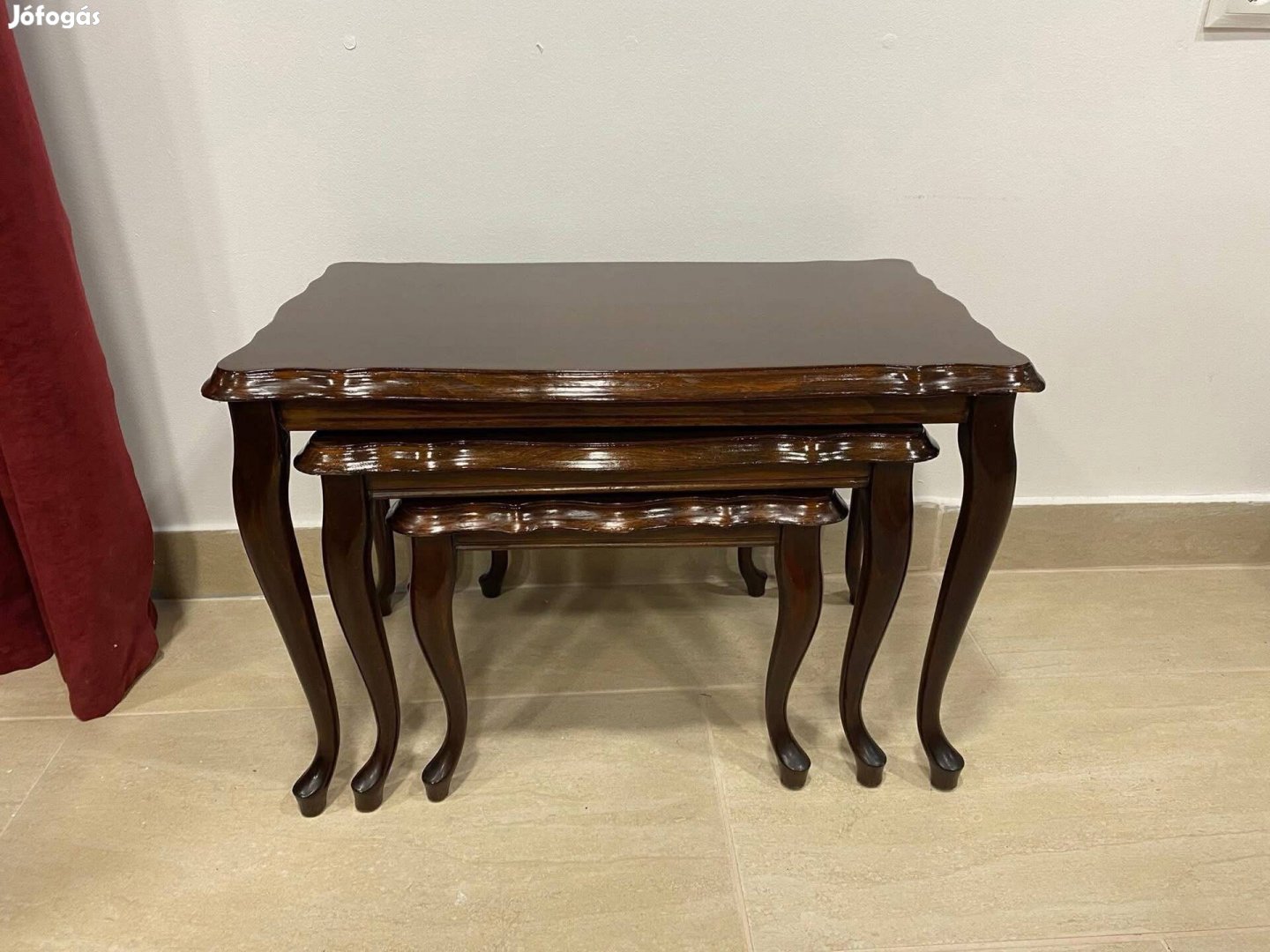 Szép állapotú neobarokk hármas lerakóasztalok eladók. A legnagyobb magassága 40 cm, 60 x 35 cm. A középső asztal magassága 35 cm, 48 x 35 cm, a legkisebb asztal magassága 36 x 36 cm.