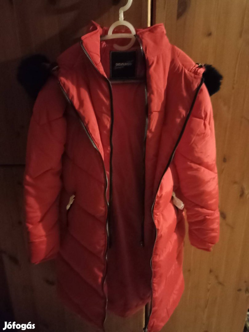 Original csomagolásban, címkékkel eladó élénk piros színű, könnyű, meleg kapucnis eredeti Devergo télikabát.