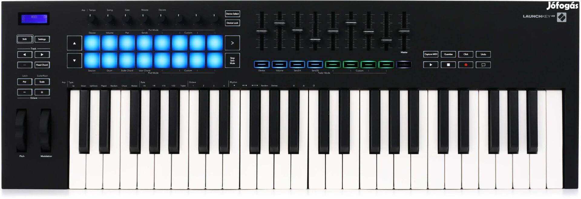 49 teljes méretű, leütésérzékeny billentyű (synth-action), 16 RGB háttérvilágítós velocity-sensitive pad, 8 rotary encoder + 9 x 45mm fader.