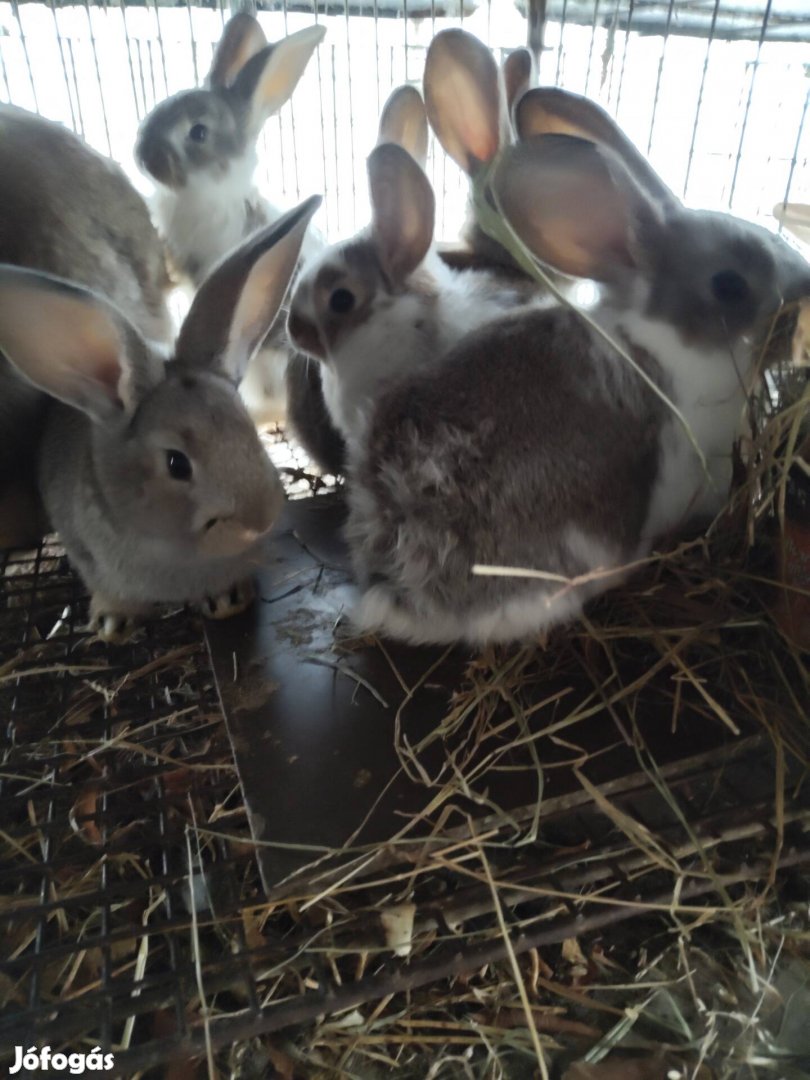 Kakucsról tovább ugrálnának különböző korosztályú és színű, szép, nagy testű házi nyulak. Leválasztásitól az ivarérettig.