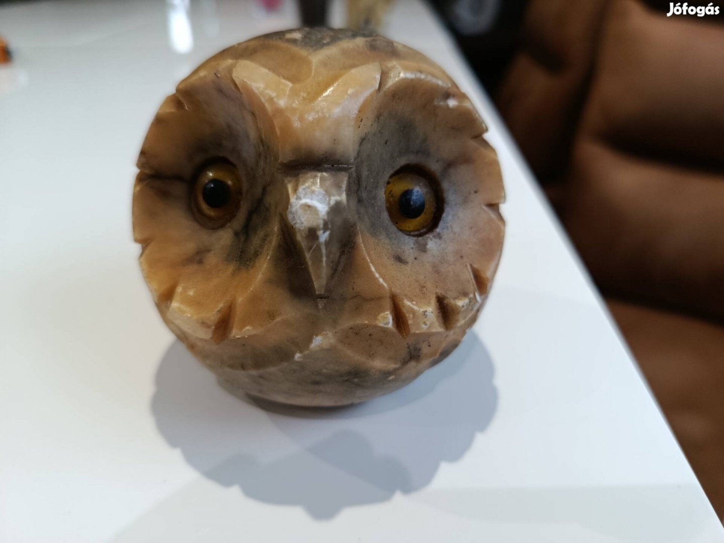 Szép állapotú, dekoratív darab. Természetes alabástrom mintázat, különleges színátmenetekkel. A szemek betétesek, nagyon karakteres megjelenésű.
