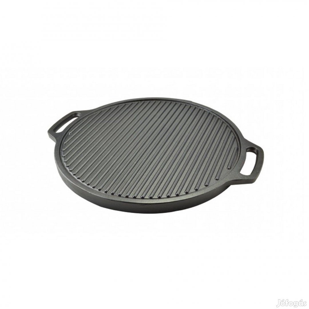 Füles öntöttvas grill sütőlap két oldalas, méretei: 45 cm átmérő, fülekkel 53 cm, teljes vastagsága 30 mm. Mindkét oldala használható, az egyik oldala bordázott, hússütésre, a másik oldala sík a szaftosabb termékek elkészítésére.