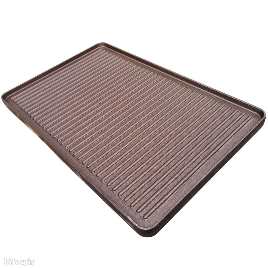 Kétoldalas öntöttvas grill lap, méretei: 60 cm hosszú, 40 cm széles, teljes vastagsága 30 mm. Mindkét oldala használható, az egyik oldala bordázott, hússütésre, a másik oldala sík a szaftosabb termékek elkészítésére
