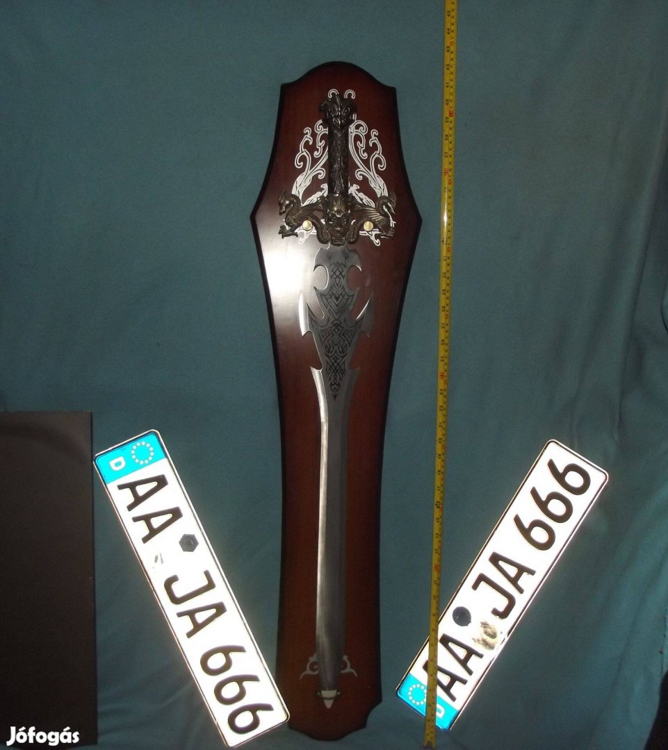 A bigyó pengéje rozsdamentes acél és nincs kiélezve . Markolat nehéz fém öntvény (nem alumínium) , a súlyán érezhető ami 2,1 Kg és teljes hossza 97 cm. A tartó fa lapon kisseb költözési sérülések láthatók ,