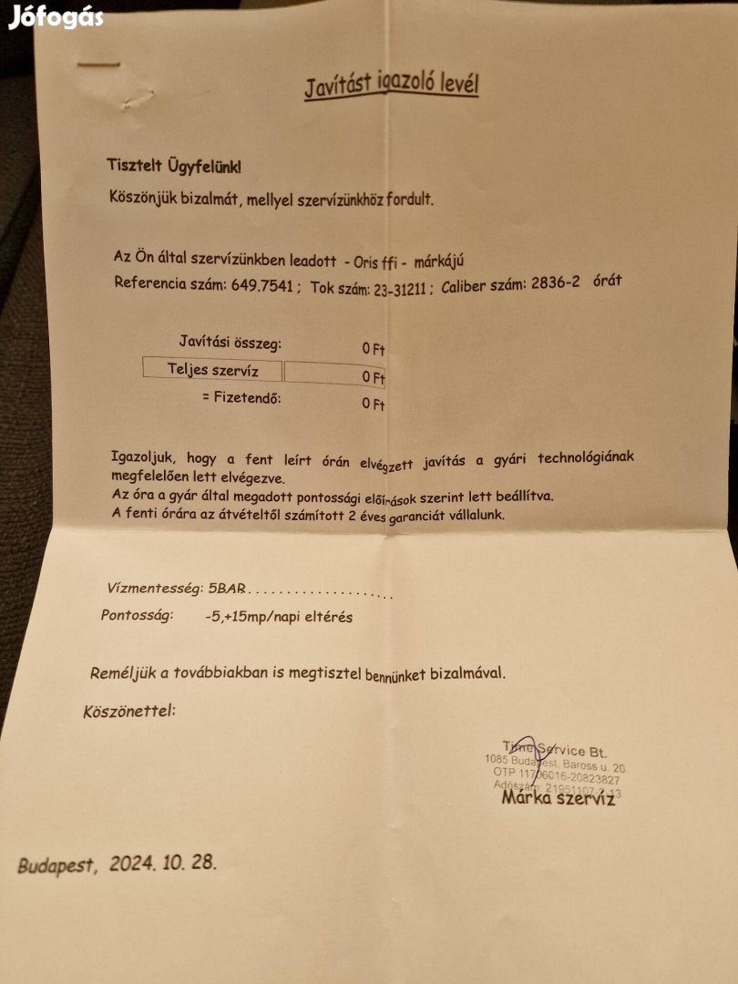 Az óra garancia papírral átadó.