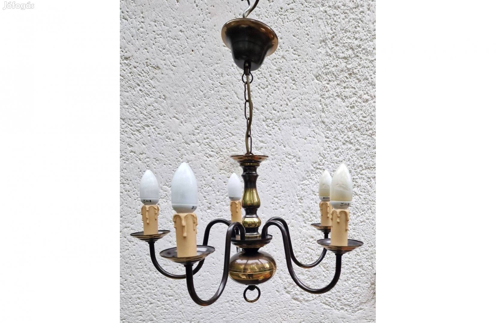 Ötkarú flamand csillár, anyaga rezezett vas, felújított. Magassága 30 cm + 28 cm lánc és a mennyezetrózsa., szélessége 46 cm.