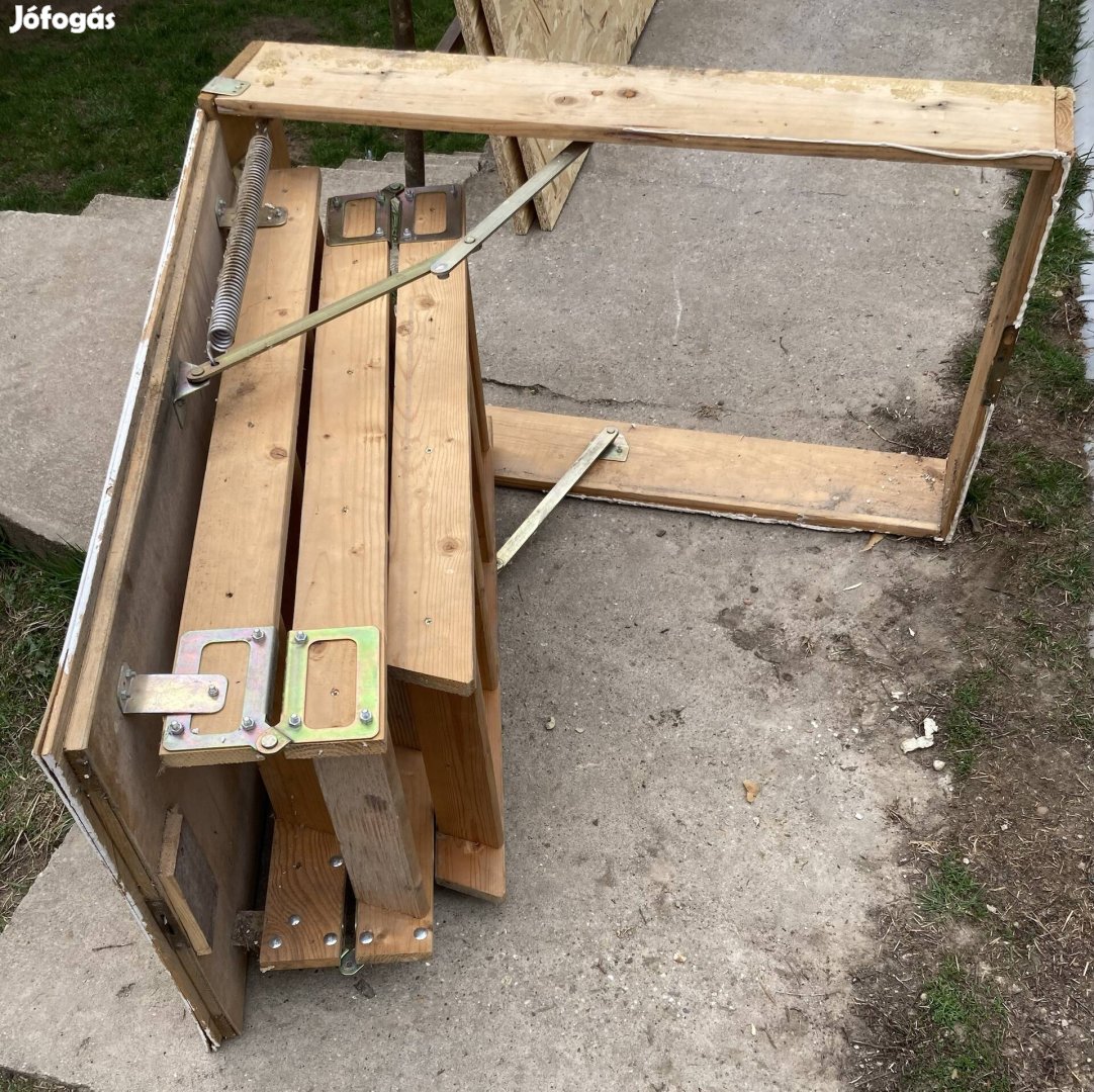 Eladó használt padlásfeljáró. Keret szélesség 107 x 58 cm, lépcső hossza 281 cm. A zár javítást igényel, de működik.