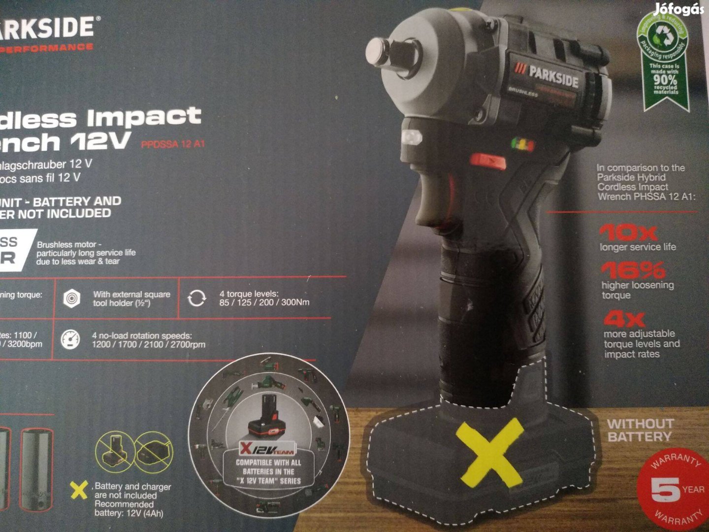 Parkside Performance Ppdssa 12 A1 12 Voltos akkus ütvecsavarozó, 350 Nm (newtonmeter) nyomaték, új, bontatlan, 5 év Lidl garanciával eladó. A garancia lejár 2030. december 11-én. Papír Lidl blokk van a géphez. Akku és töltő nélkül kerül értékesítésre, de akku és töltő ugyanitt kapható plusz pénzért. A legnagyobb nyomatékot, a 350 Nm-t a 12 Volt 5 Ah-s akkuval adja le, annak az ára 15999 Ft.