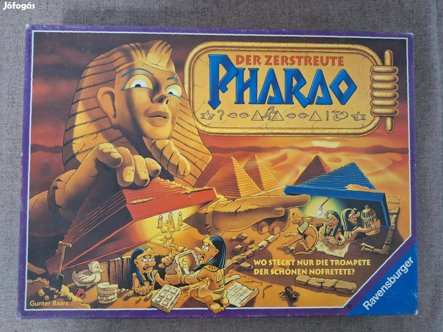 A korongokat takaró karton hiányzik,de ez csak esztétikai dolog ,nélküle is játszható a játék, a doboza viseltes,de maga a játék jó állapotú,nyomtatott magyar nyelvű játékleírással.8 éves kortól,2-5 játékos részére.A fáraó elrejtette kincseit a piramisok alá.De elfelejtette melyik kincset melyik piramis alá rejtette. Segíts neki megtalálni őket. Ebben a verzióban nehezíthetjük is a játékot azzal, hogy kutatókat is keresünk a piramisok alatt + a múmia figura is nehezíti a dolgunkat.Számlát adok róla .Még több termék a weboldalamon: