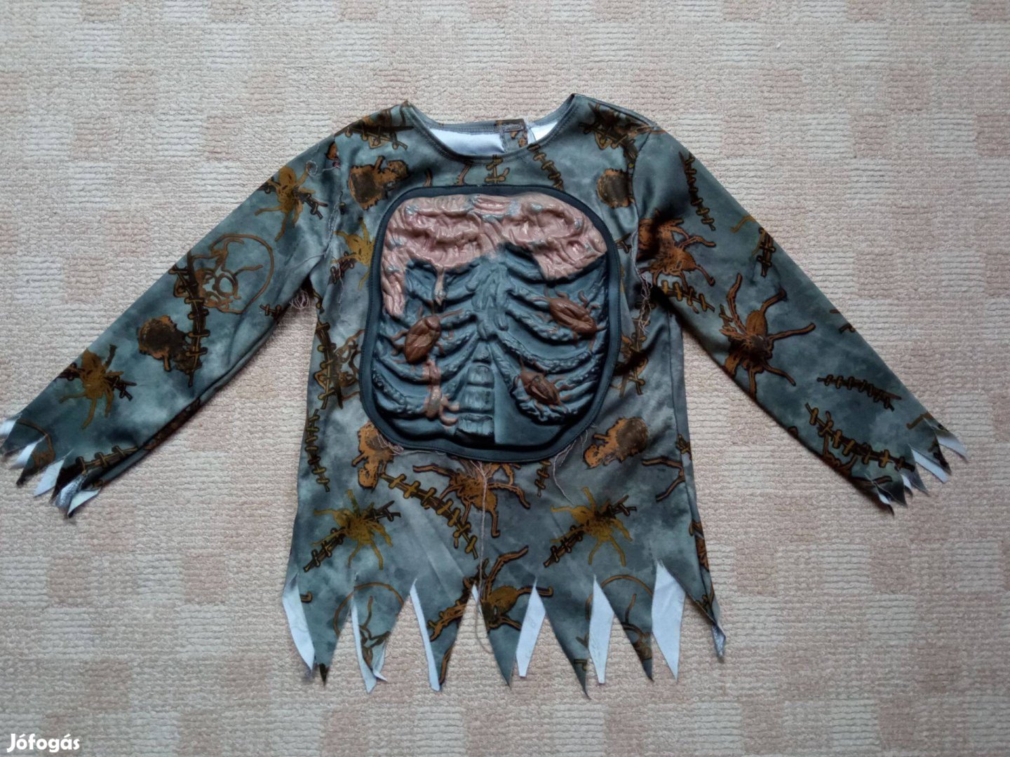 A gyermekünk nagyon szerette amikor ezt a jelmezt viselte. Mivel nem volt meg hozzá a jelmezhez tartozó alsó rész, ezt úgy oldottuk meg, hogy szürke harisnyanadrágot adtunk rá, amit több helyen kivágtunk, hogy lyukas szakadt legyen, plusz arcfestést csináltunk hozzá.