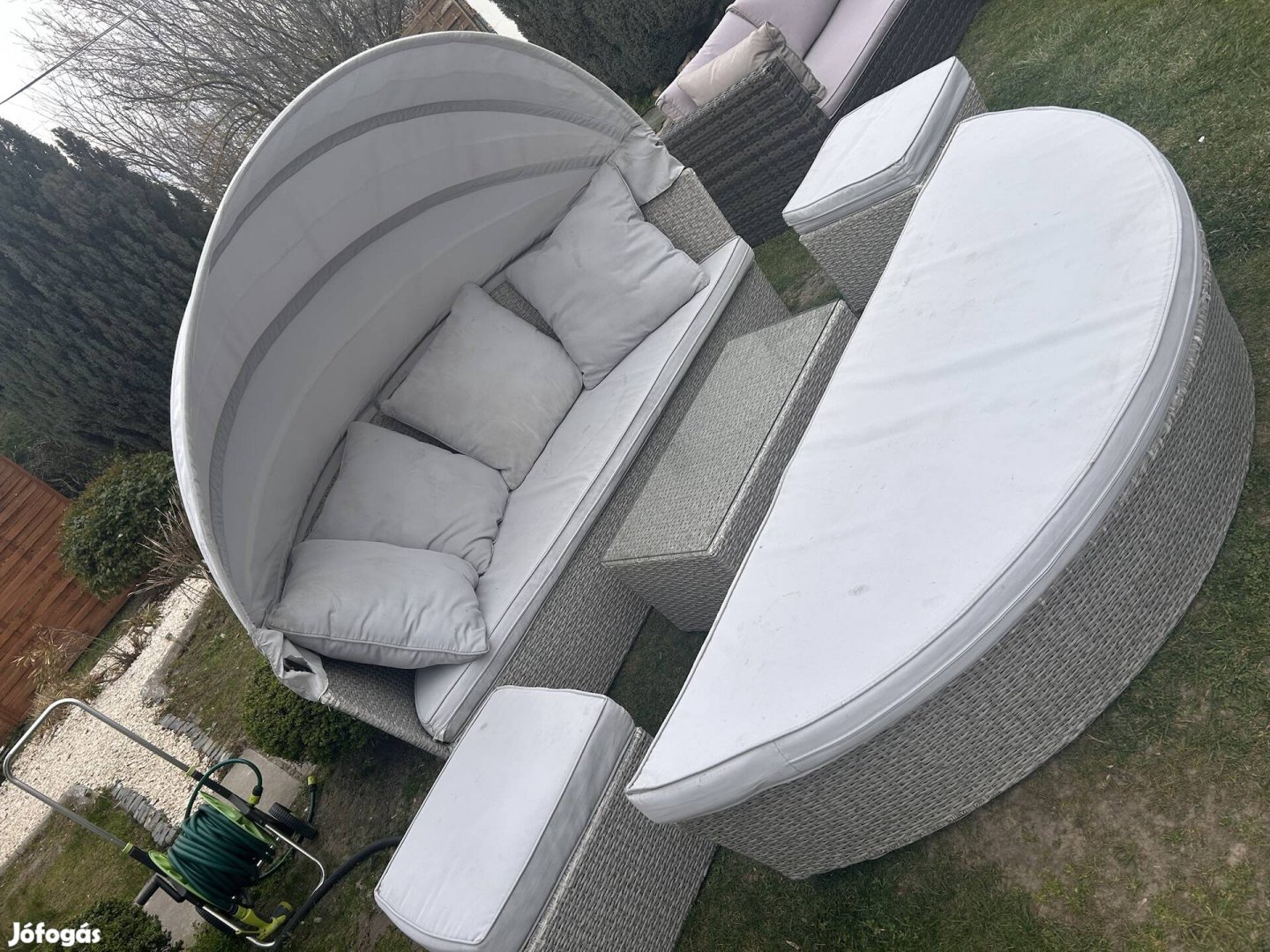 Eladó a képeken látható, megkímélt állapotú kerti bútor szett. Nagyon kényelmes, többféleképpen variálható - ideális pihenéshez, napozáshoz vagy vendégek fogadásához.
