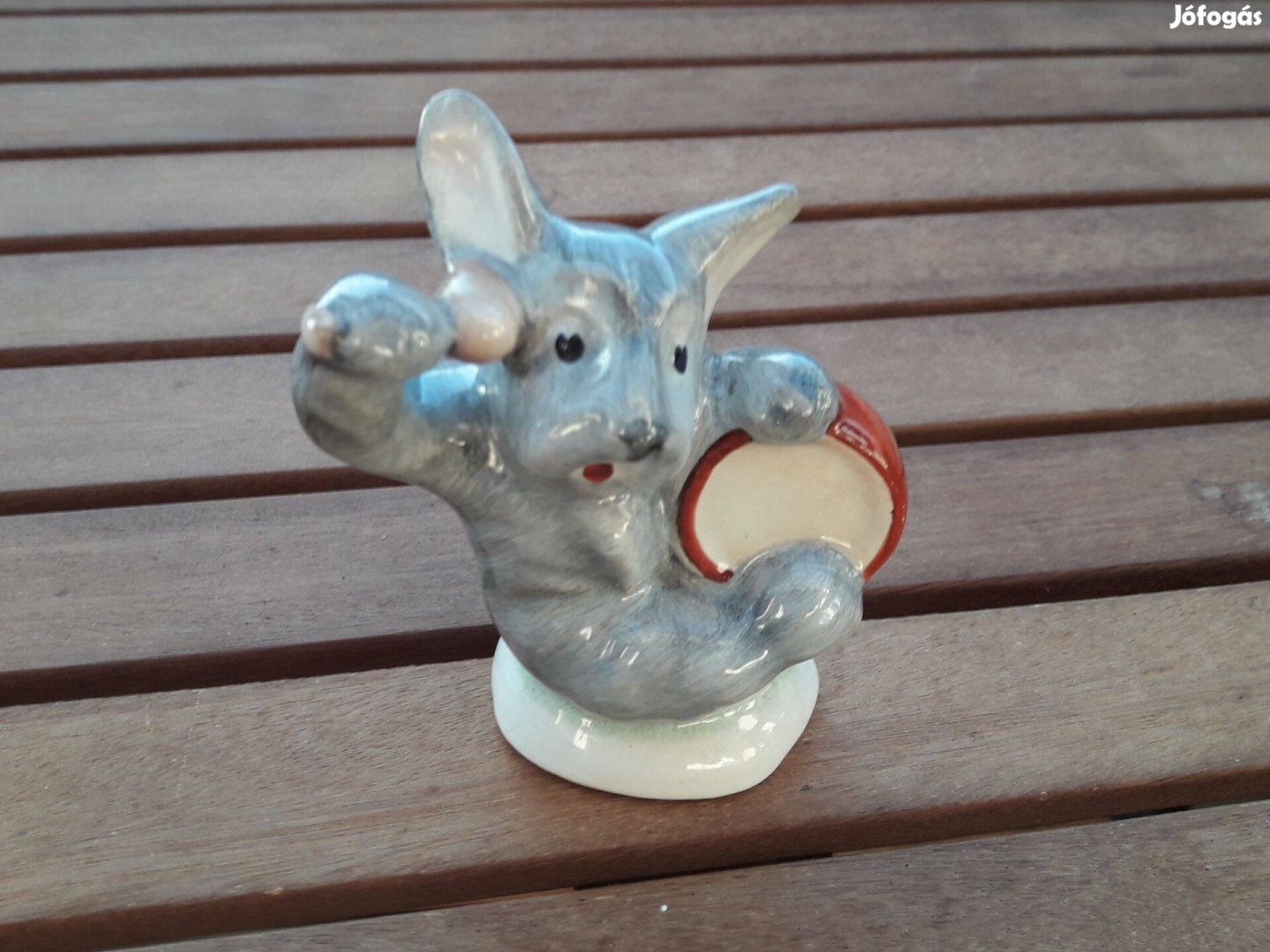 Eladó porcelán dobos kutya dísz. Szép állapotú, törés, lepattanás nincs. 9x10x5 centi.