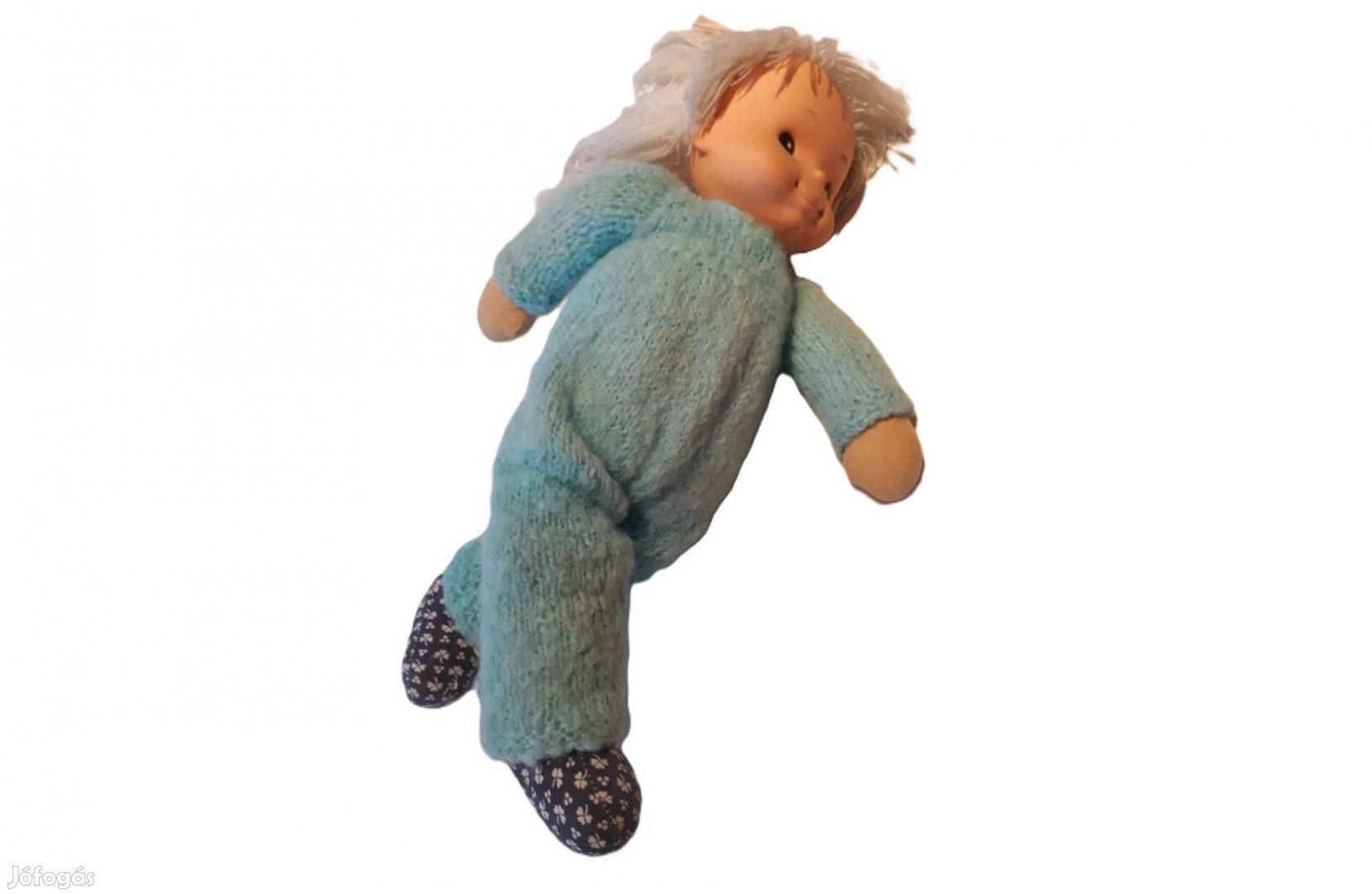 Puhatestű játékbaba kézzel kötött ruhácskában, hibátlan állapot