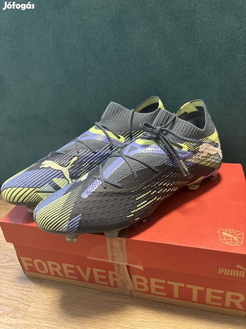Eladó egy teljesen új, sosem használt, profi kategóriás Puma Future 7 Ultimate futballcipő a látványos lila-sárga "Vortex" színösszeállításban.