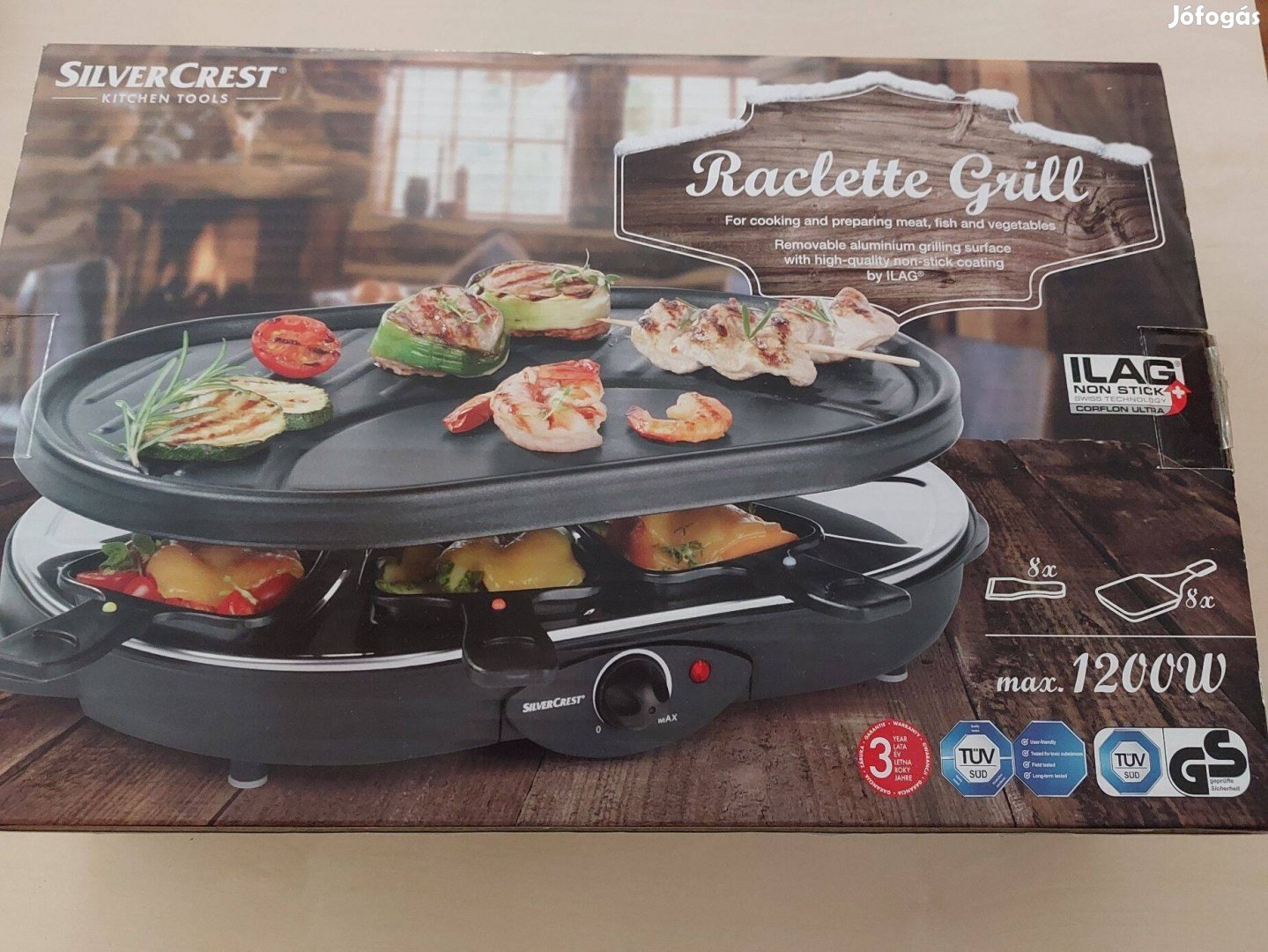 Eladó vadonatúj raclette grill 1200 W-os 8 személyes: 8 raclette serpenyőcskével, 8 faspatulával és a kezelési útmutatóval.