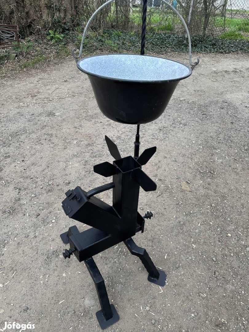 Hőálló fekete színű, állítható és kivehető bográcstartóval.