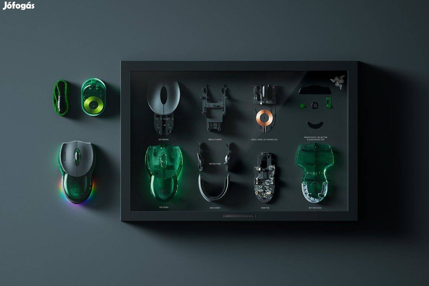 Megvilágított üvegvitrin: A csomag tartalmaz egy luxus keretet, amely az egér összes belső alkatrészét szétszerelve mutatja be üveg alatt.