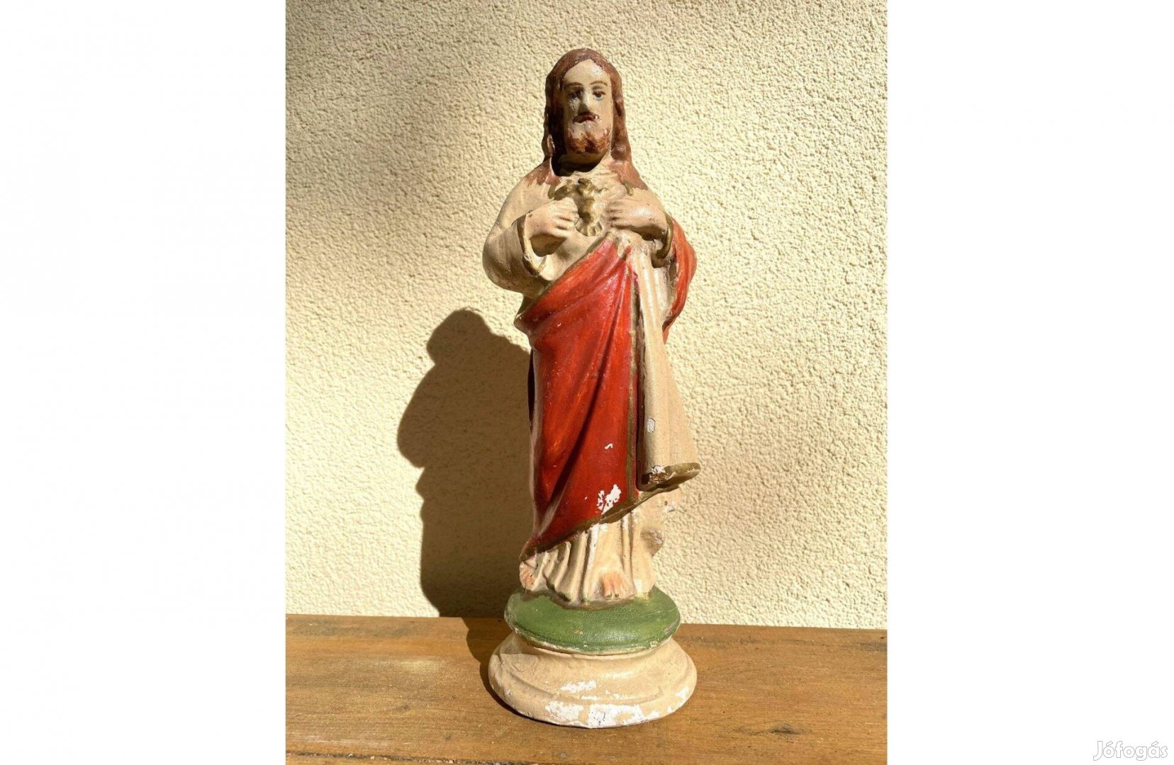 Régi Jézus szobor, gipsz, a szobor ép, nem törött és repedt, a festés néhol kopott, hiányos, korának megfelelő. Szép darab.
