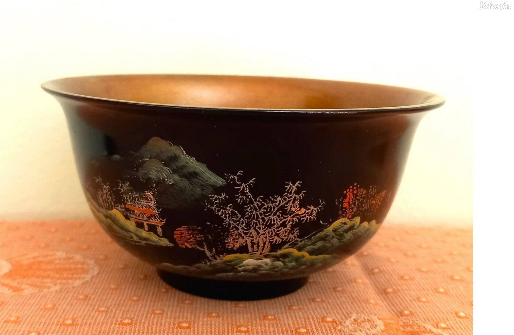 Eladó egy nagyon szép, oldalán kézi festéssel díszített, lakkozott távol-keleti cukorkás, bonbonos kínáló tálka, mutatós dekoráció, korának megfelelő használati nyomokkal, képeken látható állapotban