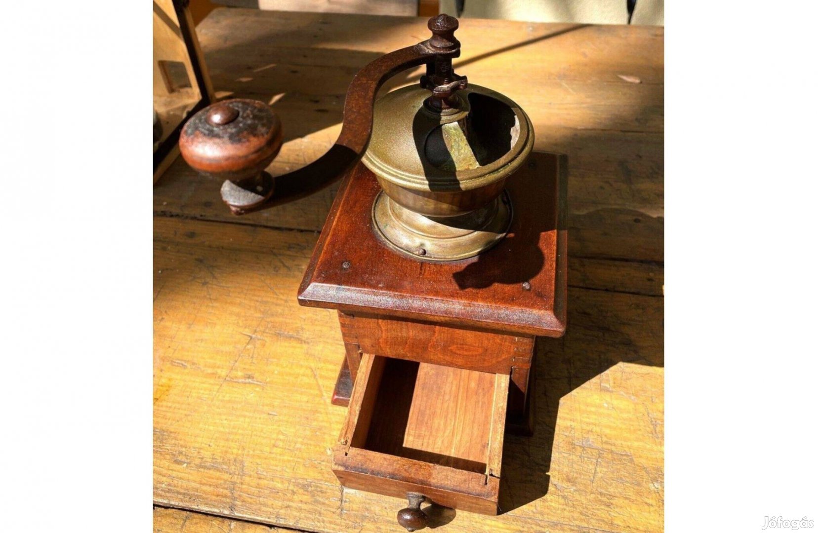 Régi konyhai kávé daráló, fa réz daráló. Magassága 26 cm.
