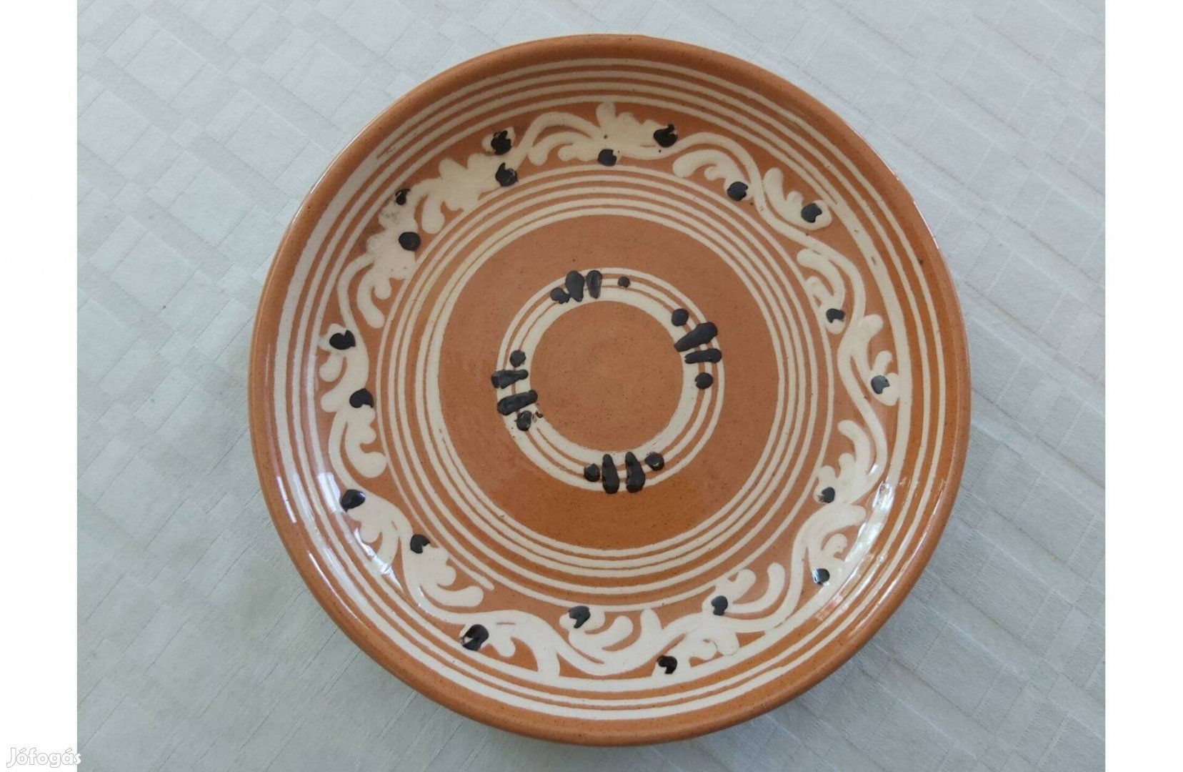 Terrakotta színű alapon fehér indás-virágos díszítéssel és fekete pöttyökkel készült, hagyományos népi motívumokat idéz.