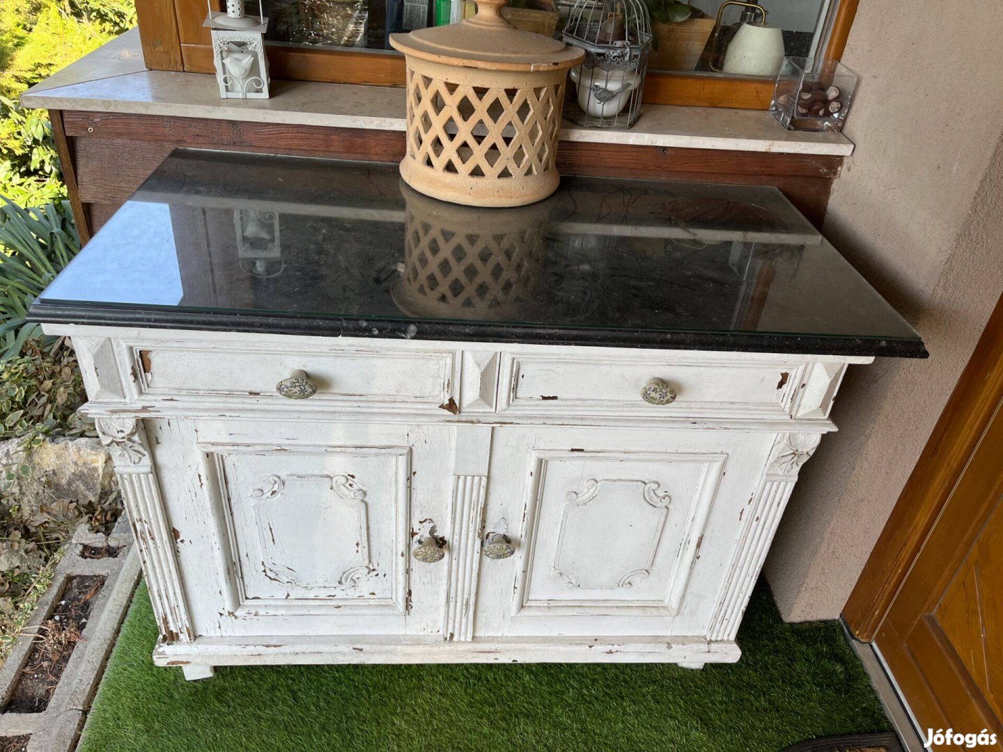 A képen látható antik régi komód gránit fed lappal, üvegfedéllel eladó! A két fiók és a szekrény belseje hibátlan!!