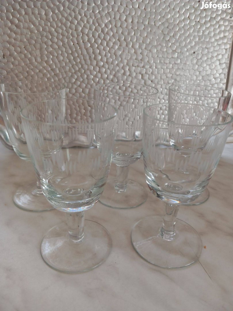 Régi talpas üvegpohár boros készlet csiszolt mintás 5db