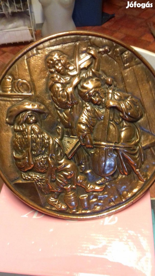 Régi tömör vörösréz nagy fali tányér zenészek dombor mintával