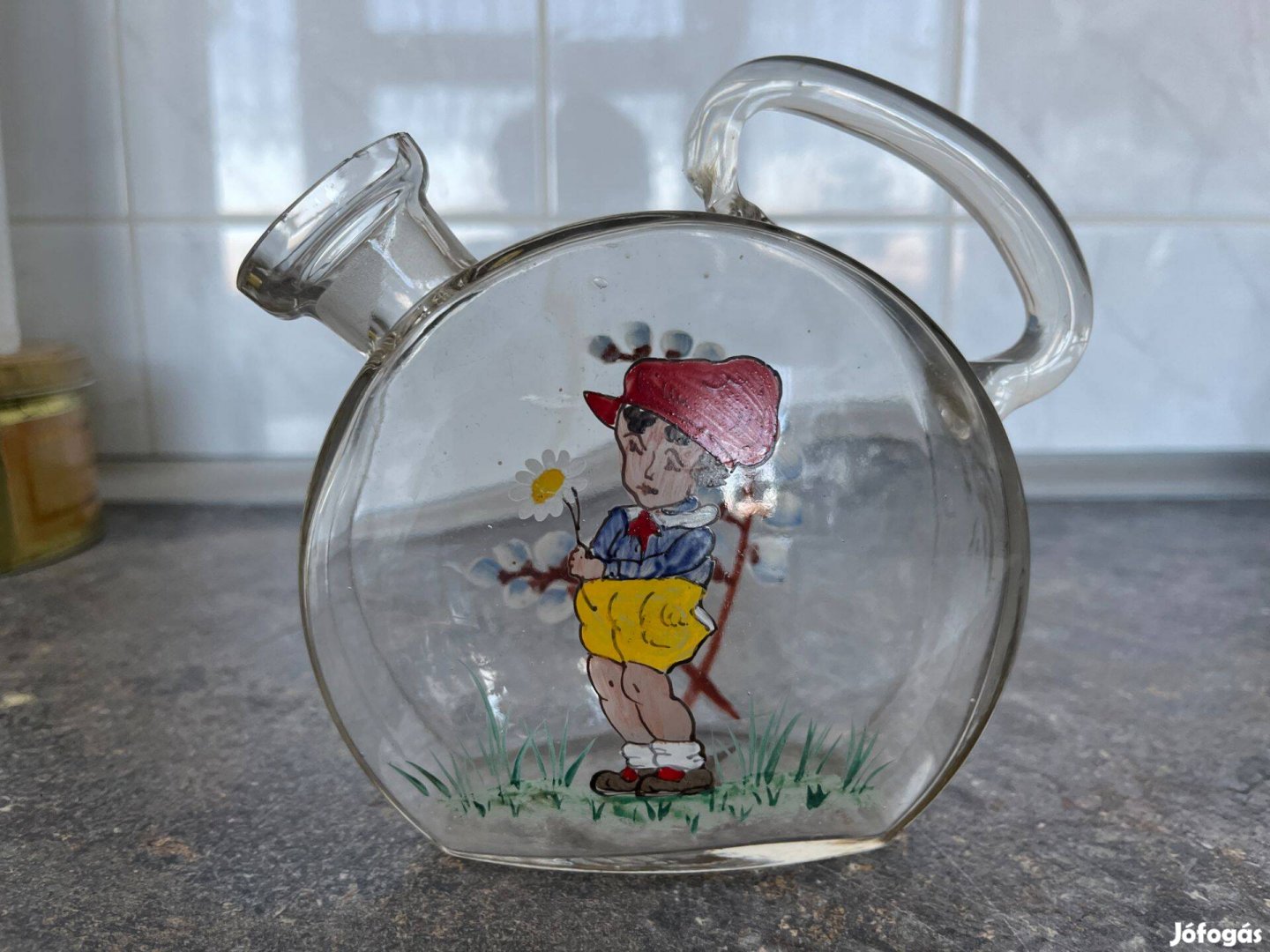 Retro , nagyon kedves üveg kiöntő . Barkával és kisgyermekkel díszített , kézzel festett . Hibátlan , 0,5 literes.