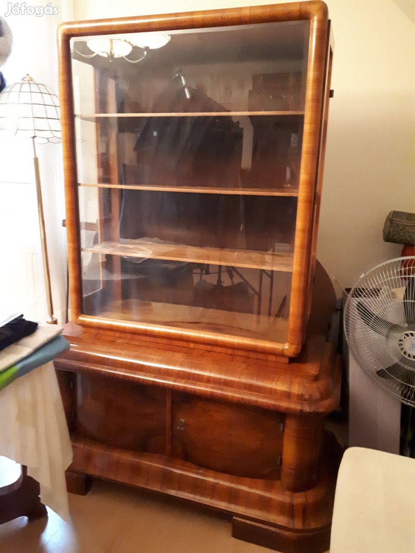 eladó a képeken látható art deco, retro tömörfa vitrin. Az alsó és felső rész külön választható, mindenhol dió furnérozott, A vitrin részben az üvegek az eredeti széleken fózolt, csiszolt üveg, a kerete kétszer késelt dió furnérozott. A kulcs megvan, a zárak működnek. Az alsó rész ajtaja íves, hajlított, Francia art deco. Asztalossal restauráltatott, stabil szerkezetű, azonnal szobába tehető és használható.