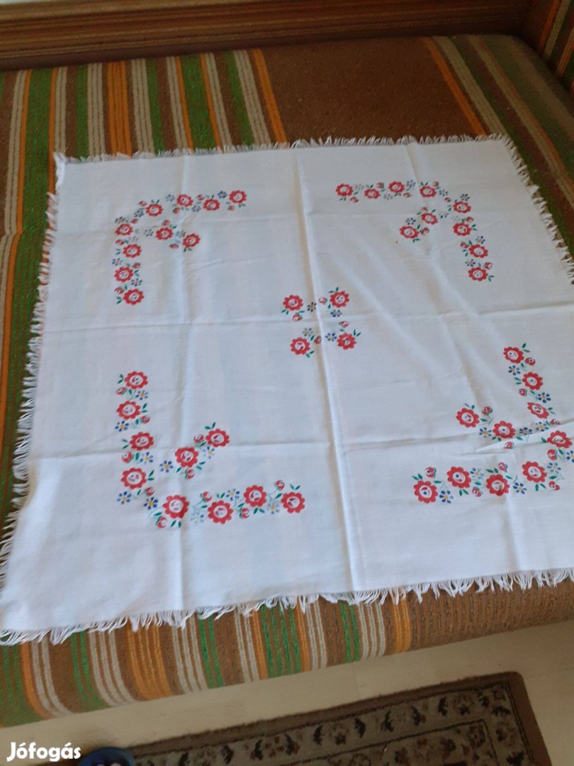 Retro festett lenvászon asztalterítő rojtos széllel 80x80cm