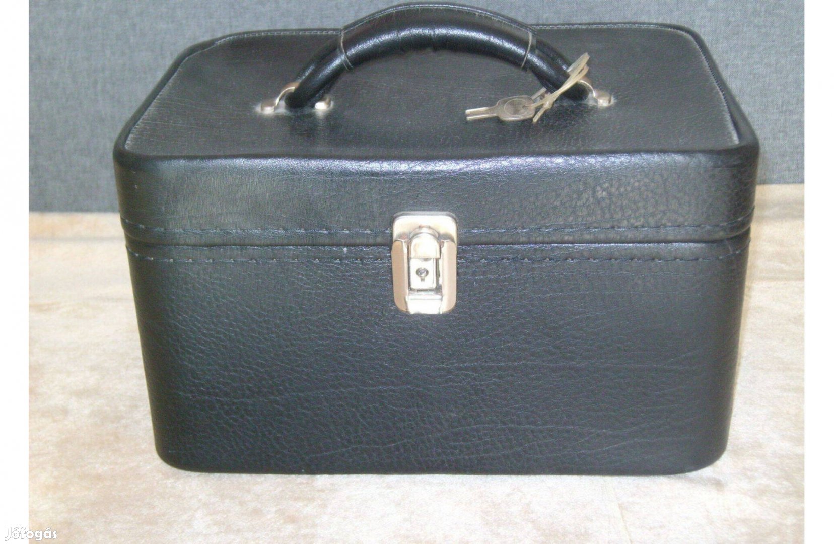 Retró ritkaság, zárható utazó pipere táska, 50 éves fekete kis bőrönd
