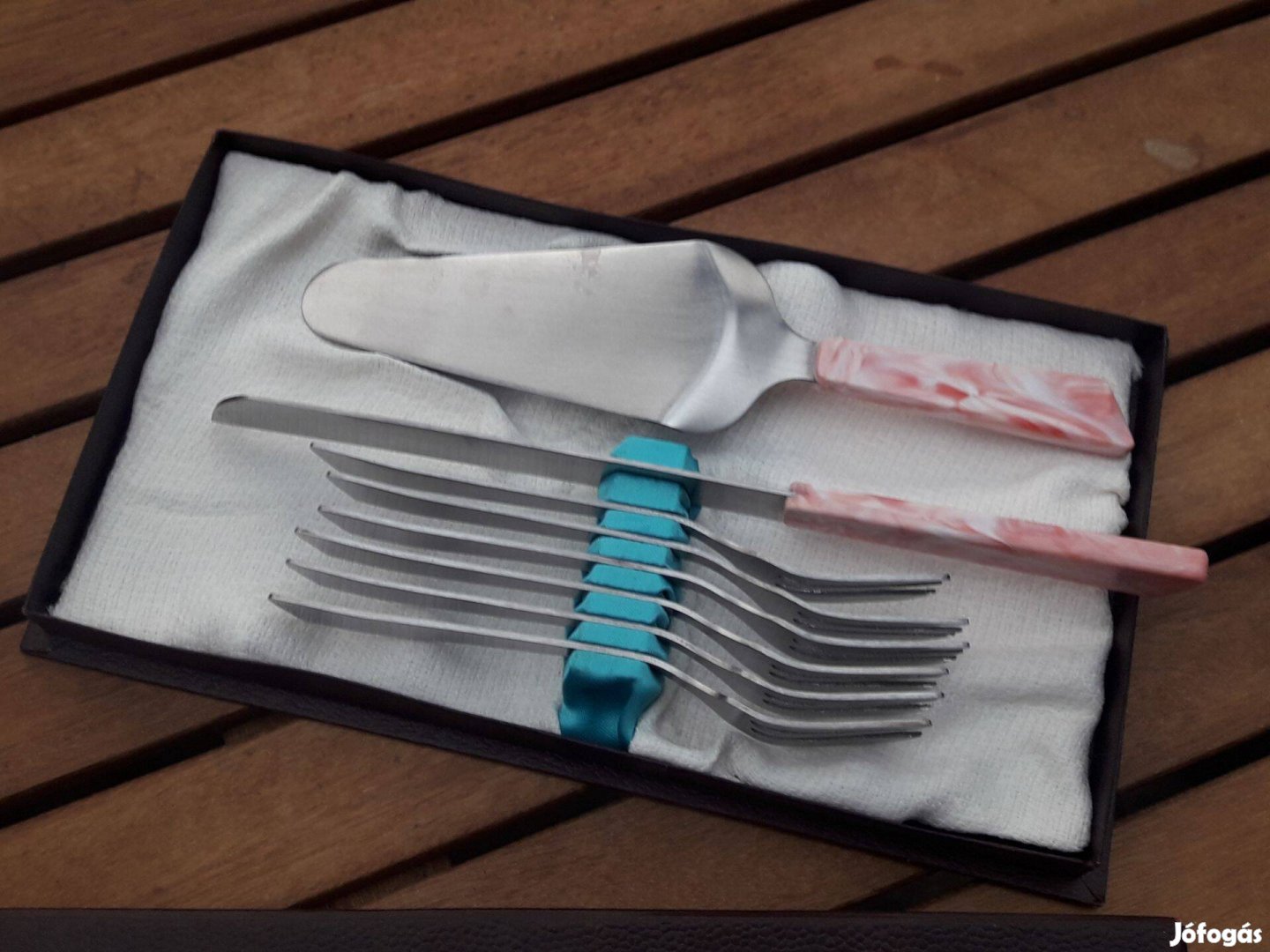 Eladó retro, régi süteményes étkészlet, desszertes étkészlet, evőeszköz készlet. Tortakés, kiszedő, villák. Régi-új, sosem volt használva. Olyan ronda, hogy már szép. Eredeti dobozban.