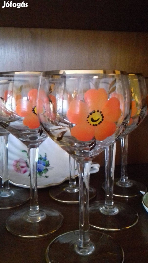 Retro talpas boros üvegpohár készlet kézi festéssel 70-es évek 6db