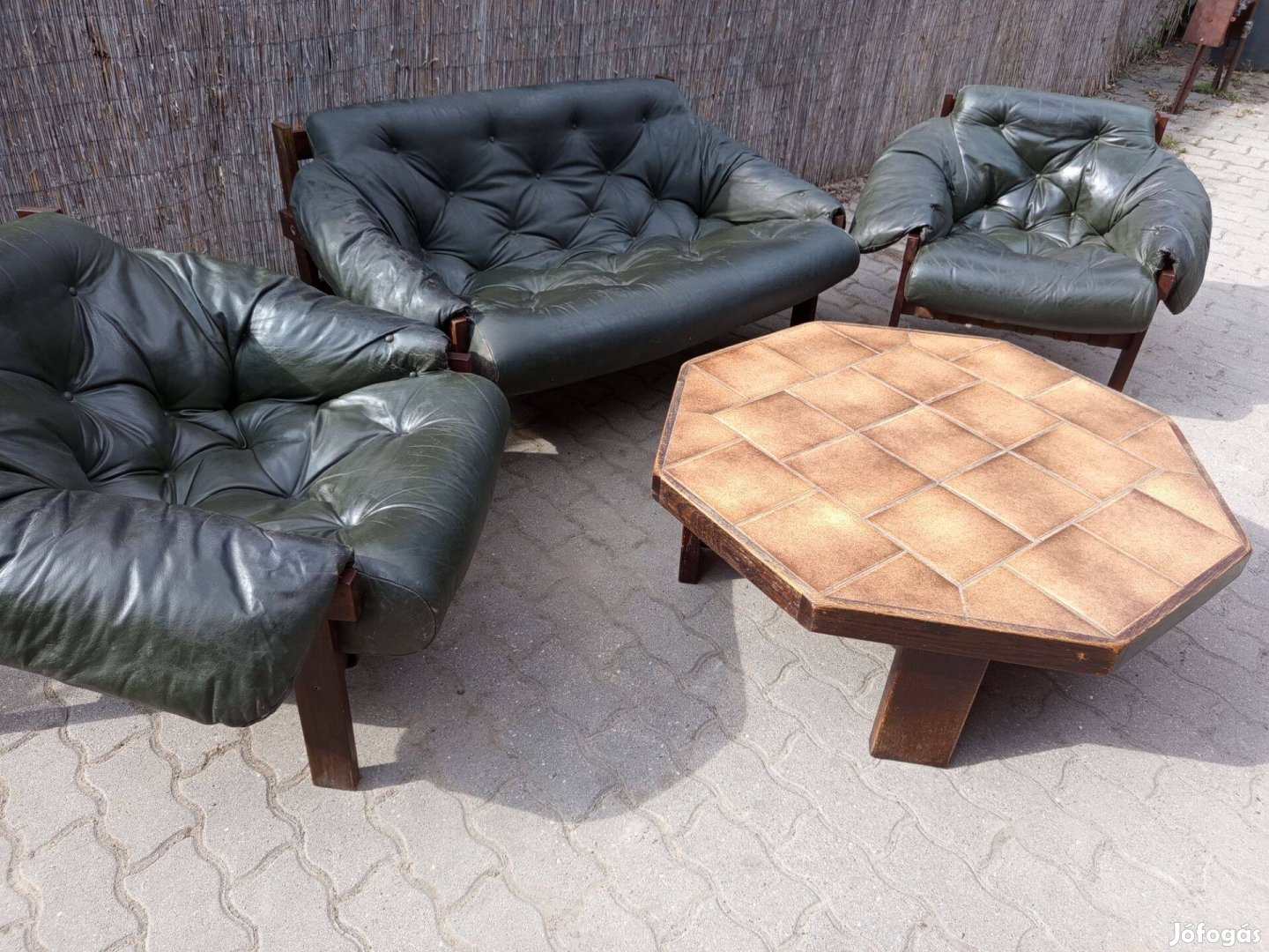 Valódi bőr ülőgarnitúra sötétzöld színű, valódi fa rusztikus dohányzó asztallal. 110000 Ft. Pest megye, Szentendre mellett található.
