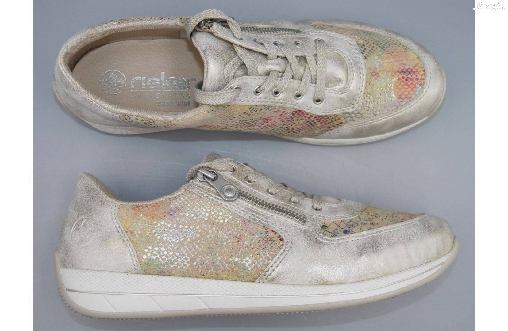 Újszerű állapotú Rieker sportos félcipő. Kivehető talpbetétje valódi bőr, felsőrésze valódi bőr-eco bőr kombináció. Praktikus cipzáros-fűzős fazonú.