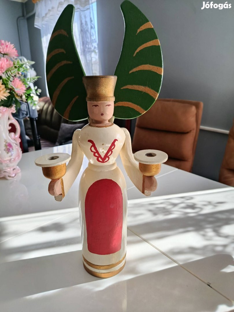 Ritka, nagyméretű Erzgebirge fa angyal gyertyatartó (48 cm)