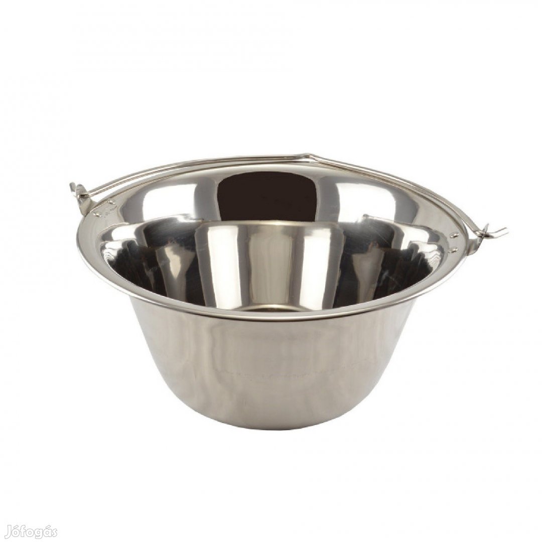 Kiváló minőségű 10 literes gulyásbogrács 1 mm vastag rozsdamentes acélból, szegecselt füllel, mérete: 38 cm széles, 19 cm magas.