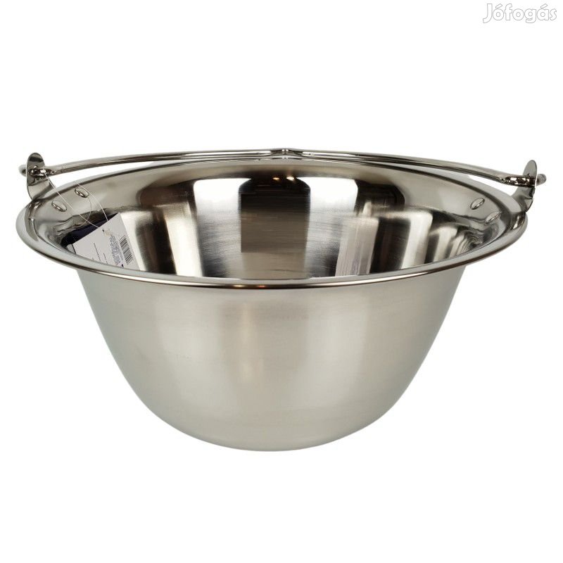 Kiváló minőségű 20 literes gulyásbogrács 1 mm vastag rozsdamentes acélból, szegecselt füllel, mérete: 48 cm széles, 22 cm magas.