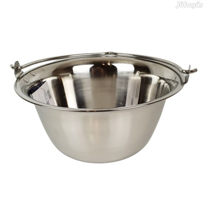 Kiváló minőségű 6 literes gulyásbogrács 0,7 mm vastag rozsdamentes acélból, szegecselt füllel, mérete: 34 cm széles, 16 cm magas, kb 1,10 kg.