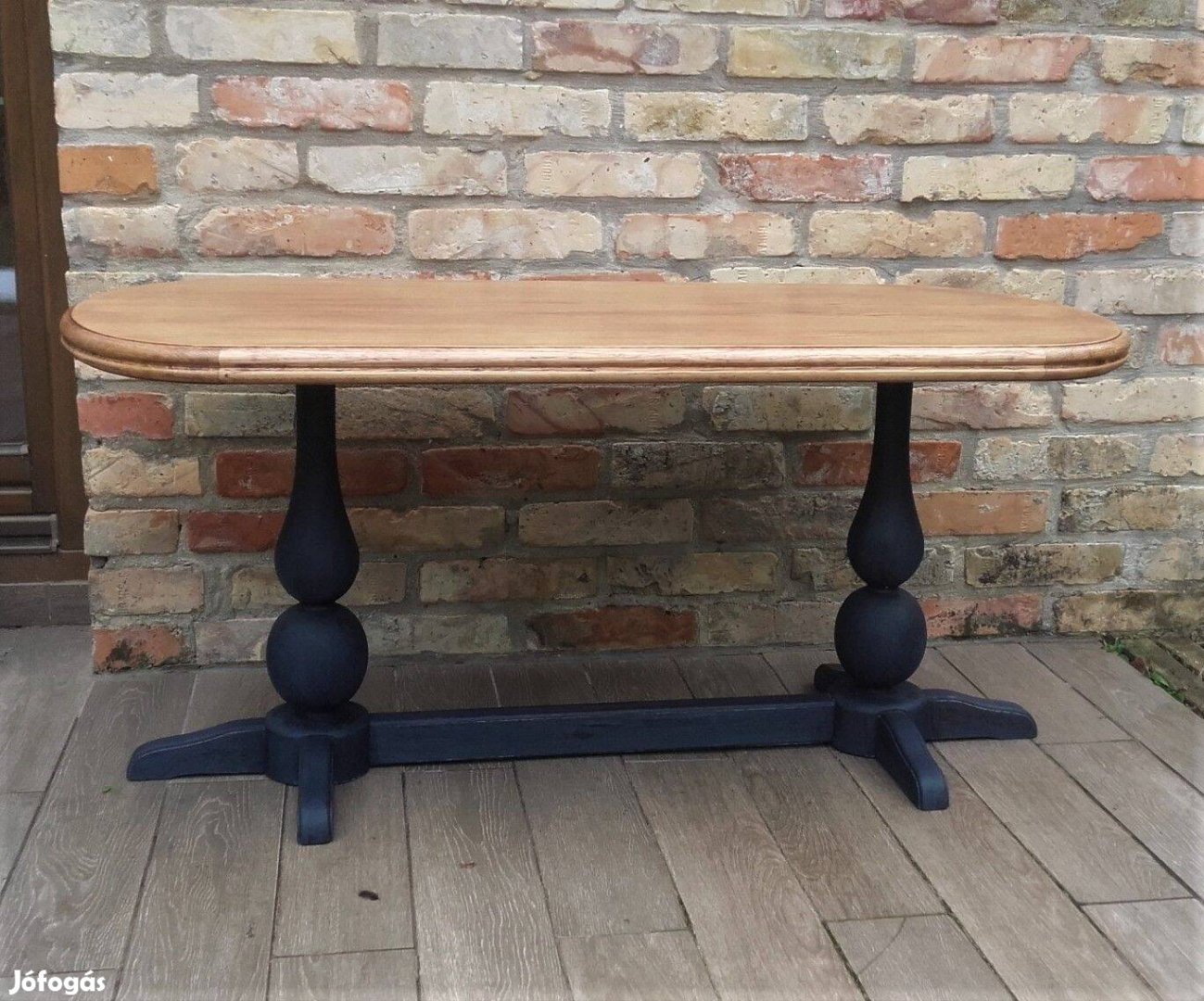 Az asztal a napjainkban kedvelt vintage stílusban készült. A lapja több rétegben lakkozott. Sötétkék koptatott lábakkal készült.
